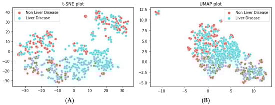 Uniform manifold approximation and projection (UMAP) and t-distributed stochastic neighbor embedding (t-SNE) have been used to better understand the performance of the models on liver disease classification. t-SNE and UMAP are used to map high-dimensional features to two dimensions, enabling clear visualization of the data. In Figure 11A, the features with the final classification representation are depicted. Figure 11A shows the features well classified into liver and non-liver disease by the extra tree classifier model. The UMAP analysis was conducted to provide a more detailed representation of the features of the data. The distinction between the liver and non-liver class of proteins can be clearly observed in the UMAP plot in Figure 11B. Both the t-SNE and UMAP plots have effectively demonstrated the strong performance of the proposed model in accurately identifying liver disease.
