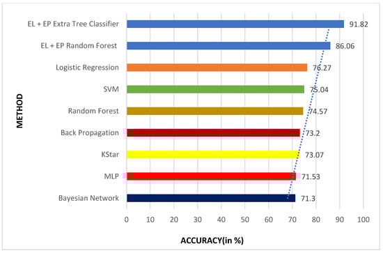 The performance of the ensemble algorithms used for liver disease classification is compared with existing works that have used the same dataset and evaluation methods. The results of the proposed work outperform many of the existing works. This is compared in Table 7 and Figure 12. The extra tree classifier shows the best results followed by the Random Forest model. The method proposed in this work uses enhanced preprocessing and ensemble machine learning and surpasses various other research works. Most of the other research works are based on simple machine learning models. Among them, Bendi et al. obtained an accuracy of 73.07% using the k star model, which is still low. The random forest accuracy for the proposed work is 86.06% and is much better than the results obtained by Sivakumar et al. for the same model. Overall, the extra tree classifier, which has not been used for liver disease classification before, surpasses all the other works with an accuracy of 91.82%.