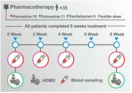 Blood samples were collected at 8–10 a.m. before drug administration; after 2, 4, and 8 weeks; before meals; and after a 30-min rest (Figure 1). The serum was separated, and the serum BDNF concentration was measured by enzyme-linked immunosorbent assay (ELISA) according to a previously reported method [46]. In brief, 96-well microplates were coated with anti-BDNF monoclonal antibodies and incubated at 4 °C for 18 h. The plates were incubated in a blocking buffer for 1 h at room temperature. The samples were diluted with an assay buffer by 100-times and BDNF standards were maintained at room temperature under conditions of horizontal shaking for 2 h, followed by washing with the appropriate washing buffer. The plates were incubated with antihuman BDNF polyclonal antibodies at room temperature for 2 h and washed with the washing buffer. The plates were then incubated with anti-IgY antibody conjugated to horseradish peroxidase for 1 h at room temperature and incubated in peroxidase substrate and tetramethylbenzidine solution to induce a color reaction. The reaction was stopped with 1 mol/L hydrochloric acid. The absorbance at 450 nm was measured with an Emax automated microplate reader. Measurements were performed in duplicates. The standard curve was linear from 0.5 ng/mL to 50 ng/mL, and the detection limit was 5 ng/mL. The cross-reactivity to related neurotrophies (NT-3, NT-4, NGF) was less than 3%. Intra- and inter-assay coefficients of variation were about 5% and 7%, respectively. The recovery rate of the exogenous added BDNF in the measured serum samples was more than 95%. All measurements were performed in triplicate, and the average value was used as the measured value.