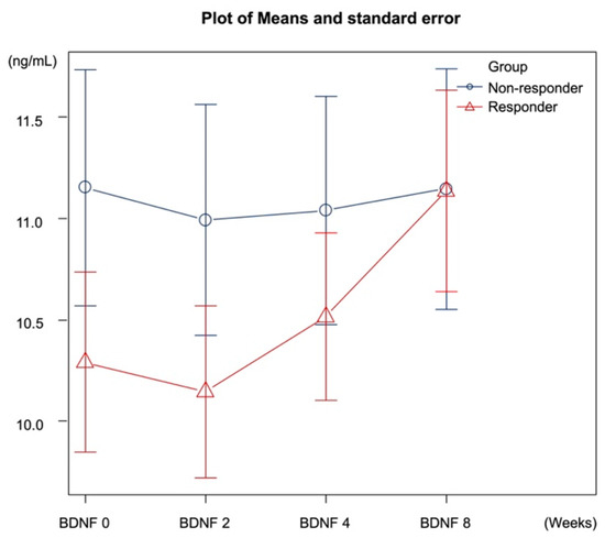 Using a mixed-effects model, changes in BDNF levels at 2, 4, and 8 weeks were compared to baseline values (0 week) in the response and non-response groups, respectively. Interactions between responders and non-responders were calculated using a mixed-effects model. Interactions were evaluated for the difference in the slope of BDNF values between the two groups compared to baseline values (0 week) at 2, 4, and 8 weeks.
