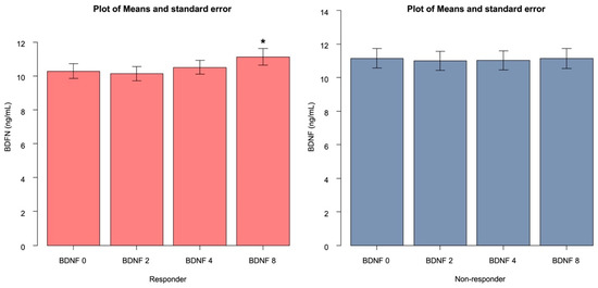 Changes in serum BDNF levels in the responders (red column) and non-responders (blue column). Data was expressed as mean and standard error. ANOVA (global test’s p-value for interaction analysis in mixed effect model; * p = 0.0025.