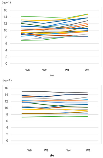 A decrease in serum BDNF levels in the early phase of SSRI treatment may be associated with a later SSRI response in adolescents with MD [39]. A previous report demonstrated that responders to treatment (≥50% improvement in depression ratings) had higher pre-treatment BDNF levels than did non-responders [52,53]. On the other hand, we found that baseline serum BDNF did not differ between the groups. A possible explanation is that baseline serum BDNF levels vary between patients (Figure 4a,b). If we confirm the result using a larger sample, serum BDNF levels the in non-responder group might be higher than in the responder group. In short, this might be a type II error. A study reported that plasma BDNF was not significantly changed after 1–2 days of single ketamine administration compared to placebo, which does not support the hypothesis that ketamine treatment increases BDNF plasma levels in patients with MD [54]. Another report demonstrated that BDNF was significantly elevated for only 1 week following the first ketamine infusion in those classified as responders [43]. No correlations were found between plasma BDNF levels and response to venlafaxine and paroxetine treatment at week 10 in patients with MD [55]. Treatment with venlafaxine for 4 weeks decreased serum BDNF levels, whereas treatment with mirtazapine for 4 weeks increased serum BDNF levels in patients with MD [56]. Treatment with mirtazapine for 12 weeks increased serum BDNF levels, which is associated with its response [57]. Based on these findings, the relationship between antidepressants, duration of treatment, and treatment response is also inconsistent and complicated.