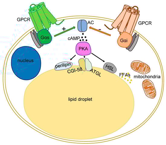 Three enzymes are mainly responsible for the catalysis of triacylglycerol into FFAs and glycerol: adipose triglyceride lipase (ATGL), hormone-sensitive lipase (HSL), and monoglyceride lipase (MGL) (Figure 1). The central regulator of lipolysis in adipocytes is the second messenger cAMP, which is produced from adenosine triphosphate (ATP) by a family of enzymes called adenylate cyclases (ACs). Nine out of ten AC isoforms are located in the plasma membrane, while one is found in the cytoplasm (soluble AC, sAC, AC10) []. Transmembrane ACs are modulated via several mechanisms: the best studied ones are the heterotrimeric G proteins (G proteins), composed of Gα and Gβγ subunits. Activation of G protein-coupled receptors (GPCRs) facilitates the GDP/GTP exchange in the Gα subunits of heterotrimeric G proteins (G proteins). Gα subunits can either stimulate or inhibit the levels of cAMP and are, therefore, named stimulatory (Gs) or inhibitory (Gi).