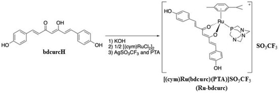 The cationic Ruthenium (Ru)(II)−cymene complex containing bisdemethoxycurcumin and the hydrosoluble PTA phosphine ([(cym)Ru(bdcurc)(PTA)]SO3CF3) (where cym = cymene, bdcurc = bisdemethoxycurcumin and PTA = 1,3,5-triaza-7-phosphaadamantane) (herein Ru-bdcurc) (Figure 1) was synthesized by a procedure similar to that previously reported [31,32]. Briefly, [Ru(cymene)Cl2]2 (306 mg, 0.50 mmol) was added to a methanol solution (20 mL) of bisdemethoxycurcumin (bdcurcH, 308 mg, 1.00 mmol) and KOH (56 mg, 1.0 mmol) and the mixture was stirred under reflux for 24 h, and then AgSO3CF3 (257 mg, 1 mmol) was added to perform the metathesis reaction and replace the Cl in the ruthenium coordination sphere with the SO3CF3 anion. The reaction mixture was stirred for 1 h and filtered to remove AgCl. PTA (PTA = 1,3,5-triaza-7-phosphaadamantane; 157 mg, 1 mmol) was finally added to the filtrate, which was further stirred for 24 h at room temperature. The solvent was then removed, and the crude product was recrystallized from a 2/1 mixture of dichloromethane and n-hexane (25 mL) by cooling to 4 °C, slowly affording an orange crystalline powder (787 mg, 0.68 mmol, yield 68%), which was identified as the complex [(cym)Ru(bdcurc)(PTA)]SO3CF3.