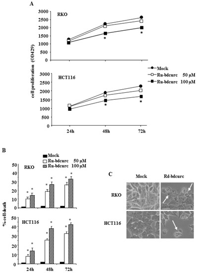Dose-and time-dependent inhibition of colon cancer cells proliferation by Ru-bdcurc. (A) RKO and HCT116 colon cancer cells were left untreated or treated with different doses of Ru-bdcurc (50 and 100 µM) for 24, 48, and 72 h before cell proliferation was measured by XTT assay. (B) Cell viability of cells treated as in (A) was measured by Trypan blue exclusion assay and (C) live cell images were taken by light microscopy. * p ≤ 0.05. White arrows indicate dead cells.