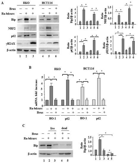 Inhibition of NRF2 reduced BiP and induced DNA damage in response to Ru-bdcurc. (A) Western blot analysis of the indicated proteins in RKO and HCT116 colon cancer cells pre-treated with 100 brusatol (Brus) for 4 h and the treated with 100 µM Ru-bdcurc for 24 h. β-actin was used as protein loading control. The ratio of the proteins level vs. β-actin, following densitometric analysis, is reported in the right panels. (B) Total mRNA was extracted from cells treated as in (A) to evaluate HO-1 and p62 gene expression by RT-PCR of reverse transcribed cDNA. Histograms represent the mean of three independent experiments ± S.D. (C) RKO and HCT116 cells were pre-treated with 100 brusatol (Brus) for 4 h and then treated with 100 µM Ru-bdcurc for 48 h. After treatment, the expression of BiP in living or dead cells was evaluated by Western blot analysis. β-actin was used as protein loading control. The ratio of BiP level vs. β-actin, following densitometric analysis, is reported in the right panel. * p ≤ 0.05.