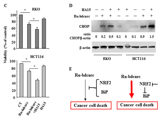 Inhibition of NRF2 or BiP increases the Ru-bdcurc cytotoxic effect in colon cancer cells. (A) RKO and HCT116 colon cancer cells were left untreated or pre-treated with 100 µM brusatol (Brus) for 4 h and then treated with 100 µM Ru-bdcurc for 24 and 48 h, before cell proliferation was measured by XTT assay. (B) Cell viability of RKO and HCT116 cells pre-treated with 100 µM brusatol (Brus) for 4 h and then treated with 100 µM Ru-bdcurc for 24 was measured by Trypan blue exclusion assay. (C) Cell viability of RKO and HCT116 cells, pre-treated with 10 µM HA15 for 1 h and then treated with 100 µM Ru-bdcurc for 48 h, was measured by Trypan blue exclusion assay. * p ≤ 0.05. (D) Western blot analysis of CHOP in RKO and HCT116 colon cancer cells pre-treated with 10 µM HA15 for 1h and the treated with 100 µM Ru-bdcurc for 48 h. β-actin was used as protein loading control. The ratio of the proteins level vs. β-actin, following densitometric analysis, is reported in the right panels. (E) Schematic summary of the negative effect of NRF2 and BiP pathways on Ru-bdcurd cytotoxic effect (left panel); inhibition of NRF2 also inhibits BiP and improves the Ru-bdcurc-induced cell death (right panel).
