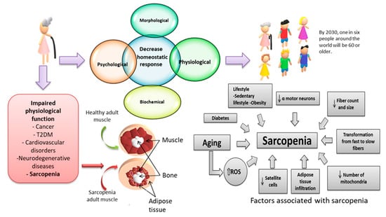Sarcopenia is a progressive skeletal muscle disorder (essential for functions, such as postural support, breathing, thermogenesis, and movements), which is represented by the loss of mass and muscle strength [36,37], as well as a decrease in the number of motor units and myofibrillar components, denervation, and atrophy for disuse associated with age [38]. Some factors that can accelerate its progression are malnutrition, chronic diseases, and physical inactivity [39].