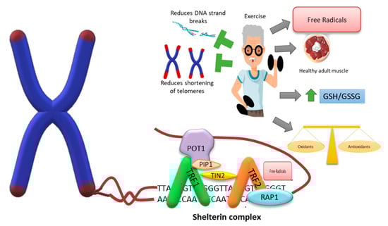 Representation of the telomere-shelterin association and effect of exercise. The ends of the chromosomes are protected by the shelterin protein complex, which prevents them from being recognized as damaged sites and from being erroneously repaired and recognized as double-strand breaks, and can generate chromosome instability. Exercise assist in maintaining or improving physical activity and is one of the main interventions for sarcopenia. Its effect lies in preventing the decrease in satellite cells, the increase in fatty tissue infiltrates in muscle fibers, and assists in obtaining bone mass, muscle mass, and skeletal muscle strength. Although exercise generates an increase in the formation of free radicals, it maintains the balance between the number of pro-oxidants and antioxidants. It also helps maintain and increase the length of telomeres, thus preventing erosion of the ends of chromosomes. Key components of the sheltering: TRF1 (telomeric repeat-binding factor 1); TRF2 (telomeric repeat-binding factor 2); POT1 (protection of telomeres protein); PIP1 (POT1-interacting protein 1); TIN2 (TRF1-interacting nuclear factor 2); and RAP1 (repressor activator protein 1).