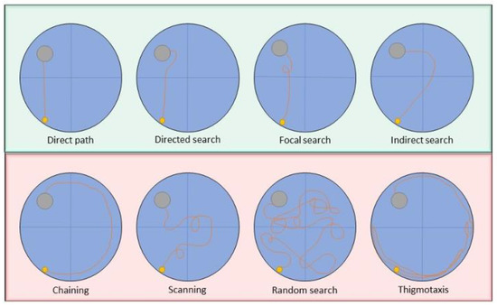 Search strategy classification by the Pathfinder system. Hippocampus-dependent strategies are also referred to as spatial strategies (green), whereas not-hippocampus-dependent are known as non-spatial strategies (red).