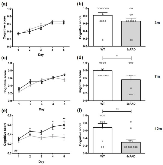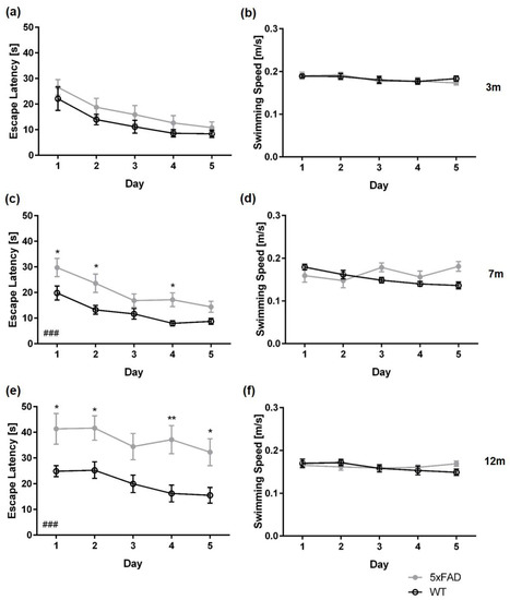 Furthermore, 12-month-old female 5xFAD mice required significantly more time to find the hidden platform on days 1, 2, 4, and 5 of the acquisition training than WT animals (Figure 2e: all p < 0.01). In addition, 12-month-old male WT mice performed significantly better than 5xFAD mice on days 4 and 5 of the acquisition training (Figure 3e: day 4 p < 0.05; day 5 p < 0.01).