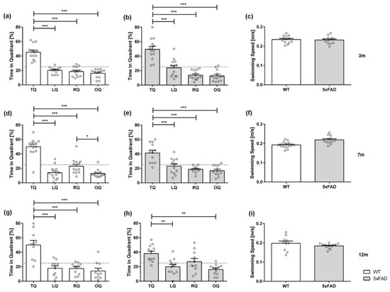Furthermore, 12-month-old WT mice, independent of sex, spent significantly more time in the target quadrant (Figure 4g: female 12 m WT F(3,44) = 13.47, p < 0.001; Figure 5g: male 12 m WT F(3,36) = 15.65, p < 0.001). However, 12-month-old female 5xFAD mice did not show a preference for the target quadrant (Figure 4h: F(3,40) = 2.978, p = 0.428; LQ vs. RQ p < 0.05). Similarly, 12-month-old male 5xFAD mice demonstrated no clear preference for the target quadrat (Figure 5h: F(3,48) = 7.247, p = 0.0004; TQ vs. RQ p < 0.05, TQ vs. OQ p < 0.01).