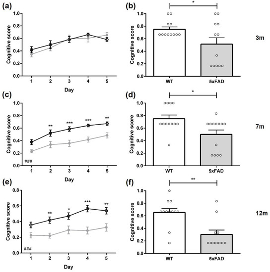 Between 3-, 7-, and 12-month-old WT mice, the cognitive score did not differ (F(2,34) = 4.478, p = 0.4602). However, 5xFAD mice showed a decline in cognitive scores with increasing age (F(2,35) = 16.56, p < 0.001).