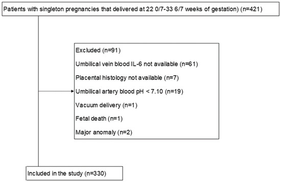Women pregnant with singletons who delivered at a gestational age of 22w0d to 33w6d between August 2014 and April 2021 were included in this study. Patients for whom the umbilical vein blood IL-6 concentration or placental histology was not available, those with an umbilical artery blood pH <7.10, and those with a major anomaly were excluded from the study. Patients who underwent a vacuum delivery and cases in which the fetus died were also excluded. Maternal steroids were administered in patients diagnosed with preterm premature rupture of the membranes (PPROM) at <34 weeks of gestation and those in whom a premature birth at <34 weeks of gestation was expected. Maternal antibiotics were administered prior to delivery in patients with PPROM or intra-amniotic inflammation and to prevent Group B streptococcus infections in newborns. Umbilical vein blood samples were obtained via venipuncture of clamped umbilical cords immediately after the delivery of the neonates and before the delivery of the placenta. The concentration of IL-6 in the umbilical vein blood was determined immediately by a chemiluminescence enzyme immunoassay (Human IL-6 CLEIA Fujirebio; Fujirebio, Tokyo, Japan). The detection range for IL-6 was 0.2–1000 pg/mL. At delivery, biopsies of the placenta, fetal membranes, and umbilical cord were fixed in 10% neutral buffered formalin.