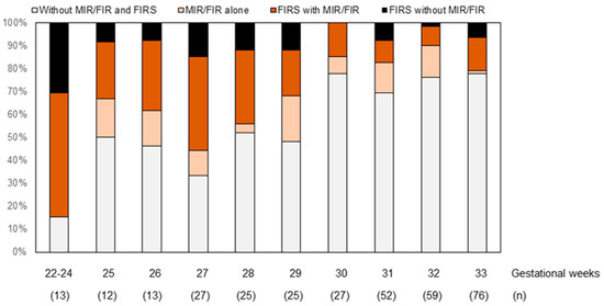 Among 421 singleton pregnancies that ended in preterm birth, 91 were excluded from this study (Figure 1). FIRS and MIR/FIR were concurrent in 19% (63/330) of the patients (Figure 2). FIRS without MIR/FIR was diagnosed in 8% (26/330) of the patients. MIR/FIR alone was diagnosed in 9% (31/330) of the patients. Neither FIRS nor MIR/FIR was detected in 64% (210/330) of the patients. The prevalence of FIRS with MIR/FIR and that of FIRS without MIR/FIR tended to decrease as the gestational weeks at delivery increased.
