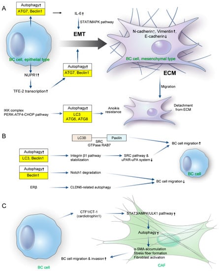 The role of canonical autophagy pathway for migration and invasion in breast cancer metastasis. (A) Epithelial–mesenchymal transition regulator. Autophagy promotes the epithelial–mesenchymal transition (EMT) in breast cancer. Activated autophagy in breast cancer cells activates EMT through increased TFE-2 transcription (and upregulation of NUPR1) and the STAT/MAPK pathway involving IL-6. Autophagy markers related to IL-6 are autophagy markers ATG7 and Beclin1 and TFE-2 related autophagy markers are LC3, Beclin1, and ATG5. During this process, the expression of N-cadherin and vimentin increases, while that of E-cadherin decreases. Cell death caused by anoikis should occur following cancer cell migration after detachment from the extracellular matrix (ECM). Nevertheless, autophagy is involved in inducing anoikis resistance of breast cancer cells through the IKK complex and the PERK-ATF4-CHOP pathway. IKK complex activates LC3, whereas ATG6 and ATG8 are activated by the PERK-ATF4-CHOP pathway. (B) Interaction of breast cancer cells to ECM-related proteins. Paxillin is one of the adhesion proteins that interacts with LC3B. This increases breast cancer cell migration through SRC or Rab7 GTPase. Furthermore, autophagy through LC3 and Beclin1 increases breast cancer cell migration by stabilizing the integrin β1 pathway and inhibiting the SRC pathway and the uPAR-uPA system. However, autophagy through Beclin1 also suggests a mechanism for suppressing migration and invasion of breast cancer cells through Notch1 degradation or CLDN6-related autophagy by ERβ. (C) Crosstalk with CAF. STAT3/AMPK/ULK1 activation occurs in CAFs by cardiotrophin 1 (CTF1/CT-1) secreted from breast cancer cells. This induces α-SMA accumulation, stress fiber formation, and fibroblast activation, which eventually increases breast cancer cell migration and invasion. BC—breast cancer; NUPR1—nuclear protein 1; TFE-2—transcription factor E-2; IL-6—interleukin-6; STAT—signal transducer and activator of transcription; MAPK—mitogen-activated protein kinase; EMT—epithelial–mesenchymal transition; ECM—extracellular matrix; IKK—IκB kinase; PERK—protein kinase R–like endoplasmic reticulum kinase; ATF4—activating transcription factor 4; CHOP—C/EBP homology protein; LC3—light chain 3; SRC—Src family of protein tyrosine kinases; GTP—guanosine tri-phosphate; uPAR—urokinase-type plasminogen activator receptor; uPA—urokinase-type plasminogen activator; Erβ—estrogen receptor beta; CLDN6—claudin 6; AMPK—adenosine monophosphate-activated protein kinase; ULK1—unc-51-like kinase 1; SMA—smooth muscle actin; CAF—cancer-associated fibroblast; ATG—autophagy related.