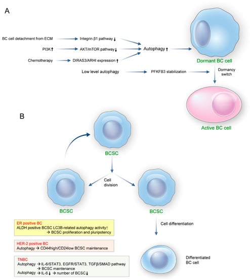 The role of autophagy in tumor dormancy and cancer stem cell biology in breast cancer metastasis. (A) Tumor dormancy regulator. Activation of autophagy in breast cancer cells promotes tumor dormancy. The mechanisms of autophagy activation include inhibition of the integrin β1 pathway by breast cancer cells detached from the ECM detachment, activation of the PI3K system in breast cancer cells, inhibition of the AKT and mTOR pathways, and DIRAS3/ARHI ectopic expression by chemotherapy. Low-level autophagy in breast cancer cells causes PFKFB3 stabilization, resulting in a switch from dormant to active metastatic tumor cells. (B) Modulator for cancer stem cell maintenance. In breast cancer, autophagy involved in the maintenance of breast cancer stem cells (BCSCs) shows differences according to molecular subtype. LC3B-related autophagy activity was high (and involved BCSC proliferation and pluripotency) in ALDH1-positive stem cells derived from ER-positive breast cancer. Meanwhile, autophagy was involved in CD44high/CD24low BCSC maintenance in HER-enriched breast cancer. Autophagy is involved in BCSC maintenance in TNBC through the IL6/STAT3, EGFR/STAT3, and TGFβ/SMAD pathways. This suggests that autophagy may reduce the number of BCSCs by reducing IL-6 secretion. BC—breast cancer; ECM—extracellular matrix; PI3K—phosphoinositide 3-kinase; mTOR—mammalian target of rapamycin; DIRAS3—DIRAS family GTPase3; ARHI—aplasia Ras homologue member I; PFKFB3—6-phosphofructo-2-kinase/fructose-2,6-biphosphatase 3; BCSC—breast cancer stem cells; LC3—light chain 3; ALDH—aldehyde dehydrogenase; IL-6—interleukin-6; ER—estrogen receptor; HER—human epidermal growth factor receptor; TNBC—triple-negative breast cancer; STAT—signal transducer and activator of transcription; EGFR—epidermal growth factor receptor; TGFβ—transforming growth factor-β; SMAD—suppressor of mothers against decapentaplegic homolog.