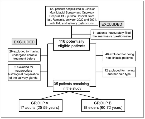 The exclusion criteria for the cases were: non-lithiasis patients and another pain type external to that of the stomatognathic system or oral–maxillofacial territory. We evaluated the clinical results obtained after applying complex rehabilitation treatment to 35 subjects, 20 women and 15 men, selected between 2020 and 2021 from St. Spiridon Hospital, Clinic of Maxillofacial Surgery and Oncology Hospital, Iasi, with salivary and TMJ dysfunctions. It is a retrospective study with limits according to the flowchart for patient selection (Figure 1).