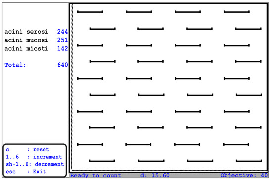 For the stereological examination, the report automatically submitted the stereological volume aspect percentage, verifying the significance of the obtained data. Quantification was carried out only in the glandular lobules, without going into the interlobular spaces. A Weibel parallel grid stereological scale was used in our study; a test surface corresponding to 540 points on the test grid with Weibel parallels was registered with the 90× objective, with a distance between two points of 19.39 μm (Figure 2).
