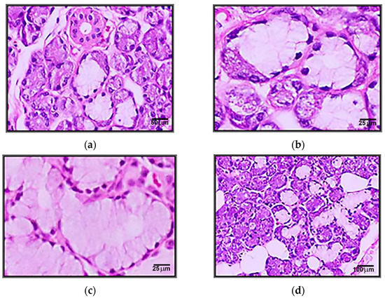 (a) Microscopic appearance of the submandibular gland with the presence of serous and mixed acini (200xH&E). (b) Coexistence of serous and mucous portions in the same acini (crescent) in the sub-mandibular gland (400xH&E). (c) Microscopic appearance of an area with mucous acini in the submandibular gland (400xH&E). (d) Microscopic appearance of the submandibular gland in the elderly with an increasing amount of adipose tissue (100xH&E).