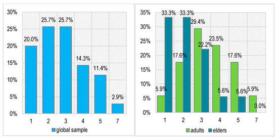 The main and common symptoms of TMDs very frequently consist of pain and accentuated stress. Related to this, the scores recorded on the diagnostic Souleroy scale indicate a large number of patients with low efficiency and maximum stress levels: 20.0% in level 1, 25.7% in level 2, and 25.7% in level 3. In the case of the adult patients, the situation is slightly better than in the case of the elders: only 1 adult patient has the minimum score of 1 (5.9%) compared with 6 elders (33.3%), 3 adults have a score of 2 (17.6%) compared with 6 elders (33.3%), and only 2 elders have an initial efficiency score of > 3 (11.2%) compared with 8 adults (47.0%). These differences are not statistically significant (Pearson Chi-squared p = 0.133).