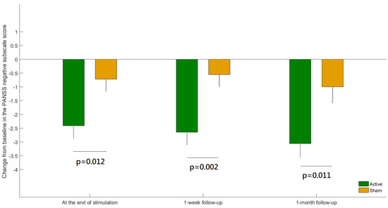 The difference between active versus sham group in the change from baseline for the Positive and Negative Syndrome Scale (PANSS) negative subscale score at each post-baseline visit. Error bars indicate standard errors of the means.