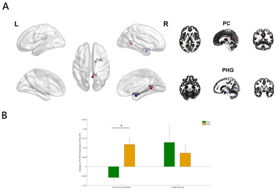 (A) Relative to the sham group, the theta-tACS group had a significant decrease in theta-band (5–7 Hz) lagged phase synchronization (LPS) between the posterior cingulate (PC) and the parahippocampal gyrus (PHG) only (B) from baseline to the end of stimulation (p value = 0.0009, corrected). Color coding: PC (right hemisphere), red; PHG (right hemisphere), blue. The figure was created using eLORETA and BrainNet Viewer. Regions of interest (ROIs) shown here are displayed on a 5 × 5 × 5 MNI template brain in eLORETA for analyses (5 mm resolution is used). Error bars indicated standard errors. * p < 0.05 (corrected).