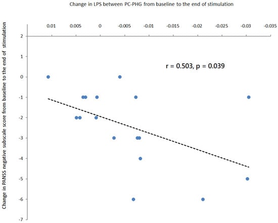Correlation analyses in patients treated with active online theta-tACS showed that a greater reduction in the LPS between the posterior cingulate and the parahippocampal gyrus from baseline to the end of stimulation was associated with a greater reduction in PANSS negative subscale score from baseline to the end of stimulation. The regression line for the linear regression slope was shown.