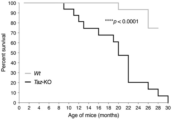 Shortened lifespan of Taz-KO mice. Kaplan–Meier survival curves from 1 month until 30 months of age were assessed by log-rank test for Taz-KO (n = 16) and Wt (n = 21) mice.
