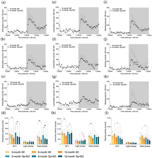 Total locomotor activity, which is the sum of all horizontal and vertical cage movements of mice, was only different between the genotypes at 12 months of age (Figure 4e–h). The total locomotor activity of Wt mice decreased as they aged from 3 to 12 months, with longitudinal differences most discernable during the dark phase. Specifically, in the light phase, two-way ANOVA indicated significant effects of genotype (p < 0.01) on total locomotor activity, with the effect of genotype dependent on age (p < 0.01). Conversely, Taz-KO mice demonstrated significantly increased total locomotor activity from either 3 or 6 to 12 months of age during the light period (Figure 4h). The light phase corresponds to the inactive phase of mice, and therefore this finding suggests possible greater disruptions in sleep cycles with aging in Taz-KO mice compared with Wt mice.
