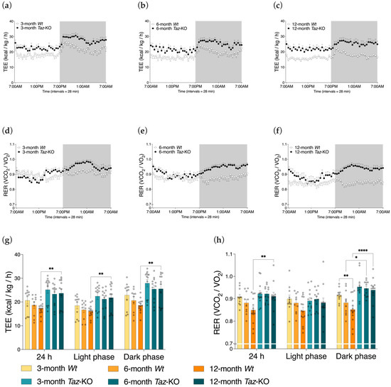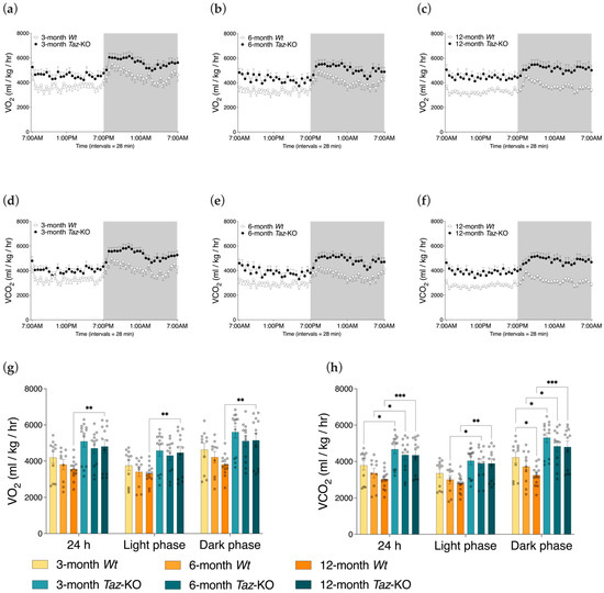 Compared with Wt littermates, Taz-KO mice had higher rates of oxygen consumption (VO2) only at 12 months of age (Figure 5a–c,g). This difference was noted in each of the light and dark cycles, and also when 24 h data were averaged. However, higher rates of carbon dioxide production (VCO2) by Taz-KO mice were noted at all three ages during the light and dark phases, and in 24 h averages, with the exception of measures taken during the light phase in 3-month-old mice (Figure 5d–f,h).