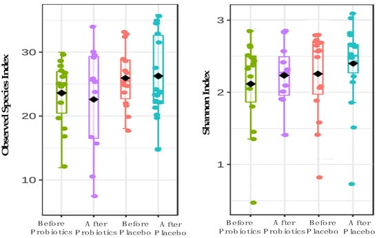 The alpha-diversity analysis using Observed species and Shannon indexes at genus level for both probiotics and placebo groups.
