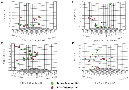 Cluster analysis showing differences in the species composition of gut microbiota present before and after the probiotic and placebo intervention in the treatment group. (A) Bray−Curtis dissimilarity analysis before and after intervention in the probiotics group; (B) Jaccard index before and after the probiotics group intervention; (C) Bray−Curtis dissimilarity analysis before and after the intervention in the placebo group; (D) Jaccard index before and after the intervention in placebo group. Differences between groups were defined as significant for a value of p < 0.05.