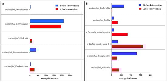 Bar graph based on LefSe analysis that demonstrates the identification of significant intestinal microbiota abundance at the species level. (A) Species mean difference before and after probiotic intervention; (B) species mean difference before and after placebo intervention.