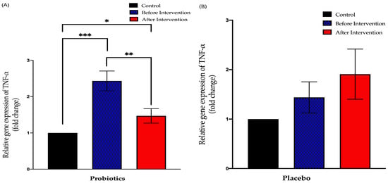 Bar graph showing relative expression of TNF-α gene (fold change) in duodenal tissue of NAFLD patients. (A) Relative expression of TNF-α gene (fold change) in the probiotics group; (B) relative expression of TNF-α gene (fold change) in the placebo group. Values are expressed as mean ± SEM (* p < 0.05, ** p < 0.01 and *** p < 0.0001). The probiotics group showed a significant downward trend compared to before the intervention while the placebo group did not show any significant change after the six-month period.