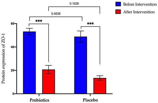 The probiotics group showed a significant decrease in ZO-1 protein expression (from 53.25 ng/mL ± 2.70 to 20.73 ng/mL ± 3.55; p < 0.0001). A significant decrease was also observed in the placebo group (from 48.89 ± ng/mL 4.79 to 13.56 ng/mL ± 1.88; p < 0.0001) (Figure 8).
