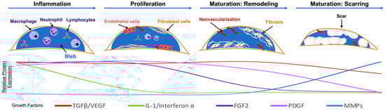 Like other surgeries, glaucoma filtration surgery induces tissue trauma. Crosstalk among various players such as growth factors, cytokines, signaling pathways, and immune regulators is critical during conjunctival wound healing. Wound healing has been defined in three distinct and overlapping phases: the inflammatory, proliferative, and maturation stages (Figure 1) [10,12,13,14]. In the inflammatory phase, plasma proteins and blood cells migrate to the site of injury. During this phase, damaged cells and pathogens are removed while bleeding is controlled. The resultant clot, platelet plug hormones, cytokines, and growth factors attract neutrophils, macrophages, and lymphocytes to the site of injury. IL-1, Interferon-α2b, and growth factors such as transforming growth factor β (TGFβ), vascular endothelial growth factor (VEGF), and platelet-derived growth factor (PDGF) are among these mediators [10].