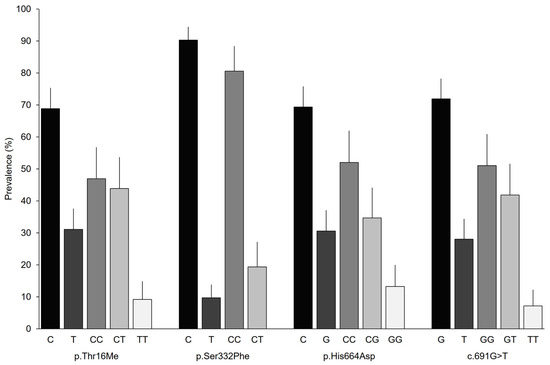 European population samples were extracted from the ALFA database [21] for each SNP included in the study (p.Thr16Met: n = 269740; p.Ser332Phe: n = 275948; p.His664Asp: n = 96876; c.691G > T: n = 223202).
