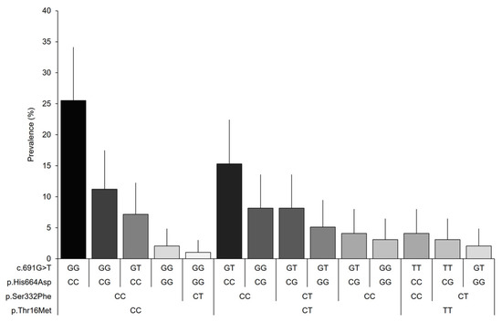 Finally, 14 genotype combinations were observed among the variants included in the study for women with fibromyalgia (Figure 2). The combination of genotypes with the allele associated with the normal activity of the DAO enzyme (25.5%) was found to be predominant, followed by the reduced DAO activity-associated alleles p.Thr16Met and c.691G > T in the heterozygous state (15.3%), and the heterozygous reduced DAO activity-associated genotype, p.His664Asp (11.2%). The prevalence of the remaining combinations was found to be below 10% in our sample; however, the prevalence for many combinations can vary in the population within the expected margins.