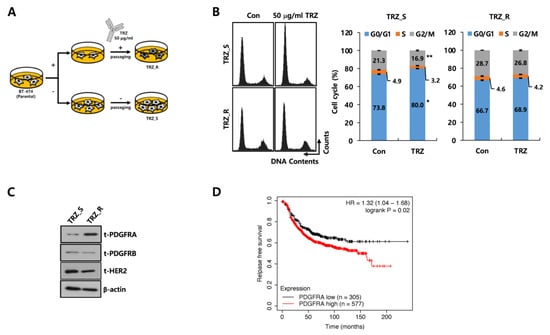 The high expression of the platelet-derived growth factor receptor alpha (PDGFRA) predicts the poor survival of patients with HER2-positive (HER2+) breast cancer. (A) A schematic model showing the generation of the trastuzumab-resistant (TRZ_R) cell line. BT474 TRZ_R cells were established by culturing wild type BT474 breast cancer cells in the presence of 50 μg/mL TRZ for around 6 months. (B) BT474 trastuzumab-sensitive (TRZ_S) and TRZ_R cells were treated with or without 50 μg/mL TRZ for 48 h. Then, the cell cycle was analyzed. Each experiment was carried out three independent times. Data are presented as the mean ± SEM (* p < 0.05, ** p < 0.01). (C) PDGFRA, PDGFR beta (PDGFRB), HER2, and β-actin levels were analyzed by Western blotting. (D) Relapse-free survival (RFS) of the HER2+ breast cancer patients with high (n = 577) or low (n = 305) PDGFRA expression were analyzed using the Kaplan–Meier plotter database. The patients were split by using the Auto select best cutoff option.