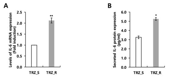 IL-6 expression is upregulated in TRZ_R cells compared to the TRZ_S cells. The levels of IL-6 mRNA and protein expression were analyzed by quantitative real-time PCR (qPCR) (A) and enzyme-linked immunosorbent assay (ELISA) (B), respectively. Each experiment was carried out three independent times. Data are presented as the mean ± SEM (* p < 0.05, ** p < 0.01).