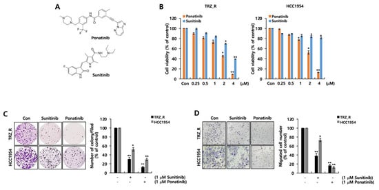 As an attempt to block the PDGFC/PDGFR signaling axis, we investigated the pharmacological effects of two PDGFR inhibitors (Figure 3A) on the growth and migration of BT474 TRZ_R and HCC1954 cells. We investigated the effects of two PDGFR inhibitors on cell viability by treating the cells with ponatinib or sunitinib at the indicated concentrations for 48 h. As shown in Figure 3B, cell viability was decreased by both ponatinib and sunitinib treatment. Ponatinib at 2 µM decreased the viability of BT474 TRZ_R and HCC1954 cells to 45.3 ± 1.5% and 52.4 ± 3.4% (compared to the control), respectively (Figure 3B). Sunitinib at 2 µM decreased the viability of BT474 TRZ_R and HCC1954 cells to 69.8 ± 1.0% and 84.0 ± 1.9% (compared to control), respectively (Figure 3B). In particular, the pharmacological effect of ponatinib was better than that of sunitinib, showing a dose-dependent effect on the cell viability of both cells (Figure 3B).