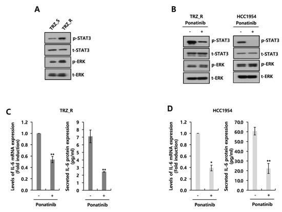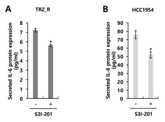 Furthermore, when we treated the BT474 TRZ_R and HCC1954 cells with 2 μM ponatinib for 48 h under serum-free conditions, we found that IL-6 expression was downregulated by ponatinib treatment (Figure 4C,D). Ponatinib at 2 μM decreased the secreted IL-6 levels in the BT474 TRZ_R cells to 2.44 ± 0.02 pg/mL compared to the control (7.11 ± 0.84 pg/mL) (Figure 4C). Under the same conditions, the levels of IL-6 secretion in HCC1954 cells were also inhibited to 22.31 ± 5.12 pg/mL compared to the control (60.60 ± 3.92 pg/mL) (Figure 4D). Finally, we examined the effect of S3I-201, an inhibitor of STAT3, on IL-6 expression through treating the cells with 20 μM S3I-201 for 48 h. The levels of IL-6 secretion in both the BT474 TRZ_R and HCC1954 cells were decreased by treatment with S3I-201 (Figure 5A,B), indicating that IL-6 was regulated downstream of STAT3.