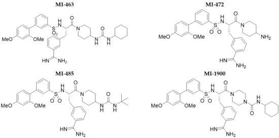 In vitro studies also confirmed that the 3-APhA-derived inhibitors such as MI-432 and MI-1900 could successfully lower viral titers in Calu-3 cells infected with SARS-CoV-2 [27] in a dose-dependent manner, most likely through TMPRSS2-mediated cleavage occurring at the S2′ site. Inhibitor MI-485, with improved selectivity against thrombin and factor Xa, showed inhibition of matriptase-dependent H9N2 influenza virus replication in Madin-Darby canine kidney (MDCK) cells [15].
