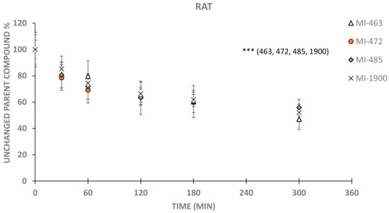 Time course of depletion of inhibitors MI-463, MI-472, MI-485 and MI-1900 in rat primary hepatocytes (5 × 105/mL) using 0, 30, 60, 120, 180 and 300 min sampling times. Relative percentage values of unchanged parent compounds were calculated by dividing the concentrations of the inhibitor measured at a given time point by mean starting MI concentration in the treatment solution (mean ± SD; n = 3–9/group). Asterisks indicate significant differences compared to starting values of the indicated inhibitors in parentheses at 300 min (*** p < 0.001).