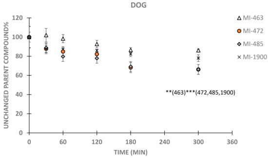 Time course of depletion of inhibitors MI-463, MI-472, MI-485 and MI-1900 in dog primary hepatocytes (5 × 105/mL) using 0, 30, 60, 120, 180 and 300 min sampling times. Relative percentage values of unchanged parent compounds were calculated by dividing the concentrations of the inhibitor measured at given time point by mean starting MI concentration in the treatment solution (mean ± SD; n = 3–9/group). Asterisks indicate significant differences compared to starting values of the indicated inhibitors in parentheses at 300 min (** p < 0.01, *** p < 0.001).