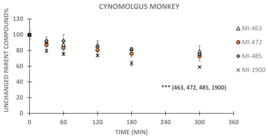 Cynomolgus monkey hepatocytes could convert all inhibitors significantly after 120 min treatments (pMI-463, 120 min < 0.001; pMI-472, 120 min = 0.0109; pMI-485, 120 min = 0.0015; pMI-1900, 120 min < 0.001). It was also observed that MI-1900 was depleted at the highest speed, and even from 60 min the decomposition was much higher compared to initial values (Figure 4). No chemical structure-related differences were observed in cynomolgus macaque hepatocytes at 300 min sampling time in the case of MI-463, MI-472, MI-485 and MI-1900 (p values ranged between 0.06 and 1).