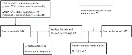 Following the removal of duplicates from the search results, the titles and abstracts of the remaining studies were reviewed for potential eligibility. Following that, full texts of the publications recommended for inclusion were screened, and their references were checked for any further research that was required. Articles that did not discuss the relationship between NMDA, AMPA, and SE were excluded. The review contained 137 papers in total (Figure 1).