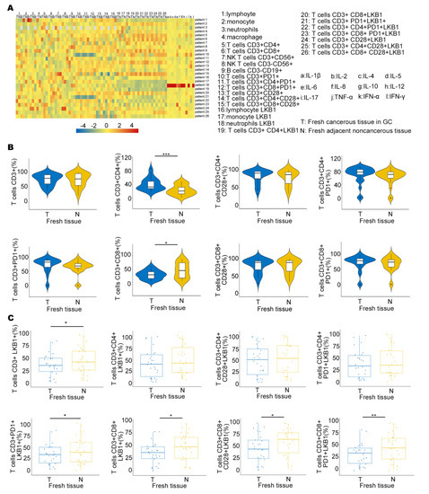 LKB1 is associated with T cell infiltration in GC patients. (A) The heatmap showing the immune cell proportion in peripheral blood (B), fresh cancerous (T) and adjacent non−cancerous tissues (N), and cytokine expression. (B) The ratios of different kinds of T cells in fresh cancerous (T) and adjacent non−cancerous tissues (N). (C) Differential proportions of T cells expressing LKB1 in fresh cancerous (T) and adjacent non−cancerous tissues (N). Paired t-test, * p < 0.05, ** p < 0.01, *** p < 0.001.