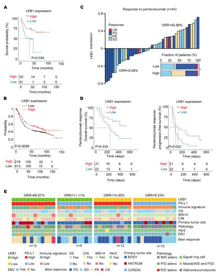 LKB1 expression predicts responsiveness to pembrolizumab in GC patients. (A) High levels of LKB1 expression were associated with prolonged survival in GC patients from 2015 to 2019. (B) The Kaplan−Meier Plotter showed that high levels of LKB1 prolonged the survival of GC patients. (C) The stacked bar and waterfall plots showing responsiveness to pembrolizumab in the ICB cohort (n = 43) based on LKB1 expression. (Pearson’s χ2 test). (D) Kaplan−Meier curves of progression−free survival (PFS) and overall survival (OS) in the ICB cohort (n = 43) based on LKB1 expression. (E) Based on LKB1 mRNA expression in the subgroups of GC patients with PD−L1 high and low expression, the heatmap demonstrated responsiveness to pembrolizumab and molecular parameters in the ICB cohort (n = 43). GS, genomically stable; MSI−H, microsatellite instability−high; EBV, EBV positive; signet ring cell: gastric signet ring cell carcinoma; ORR, objective response rate; SD, stable disease; PR, partial response; PD, progressive disease; CR, complete response; M/D adeno, moderately differentiated adenocarcinoma; P/D adeno, poorly differentiated adenocarcinoma; W/D adeno, well−differentiated adenocarcinoma; Mixed (W/D and P/D), well−differentiated adenocarcinoma and poorly differentiated adenocarcinoma.